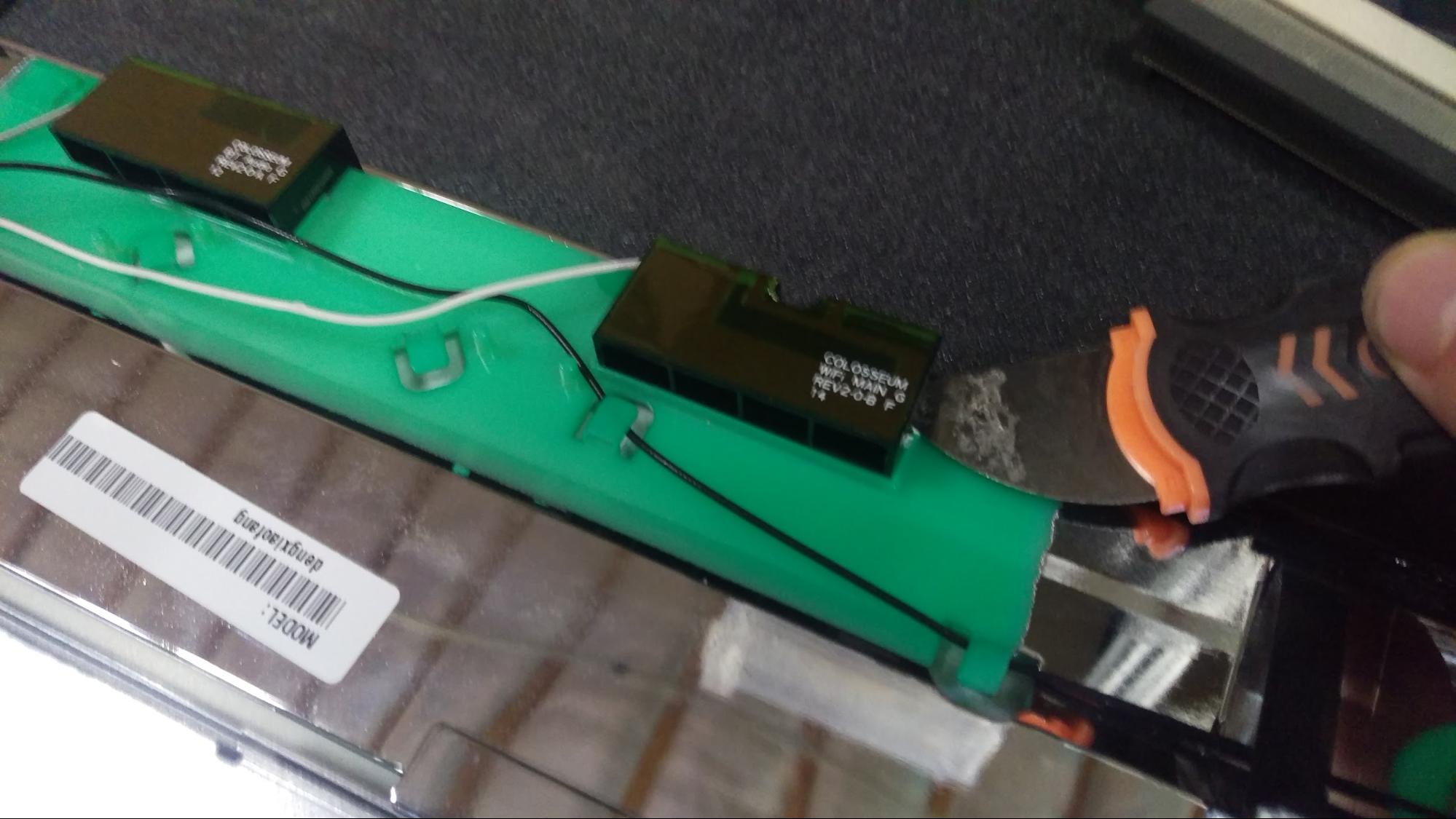 The wireless radio (Bluetooth and Wi-Fi) antennas are easily removed, but have excess adhesive and it might feel like they’re unremovable. Gentle application of heat via heat gun will help loosen the adhesive, but you will need to use a pry tool between the antenna and the plastic frame to remove the parts completely.