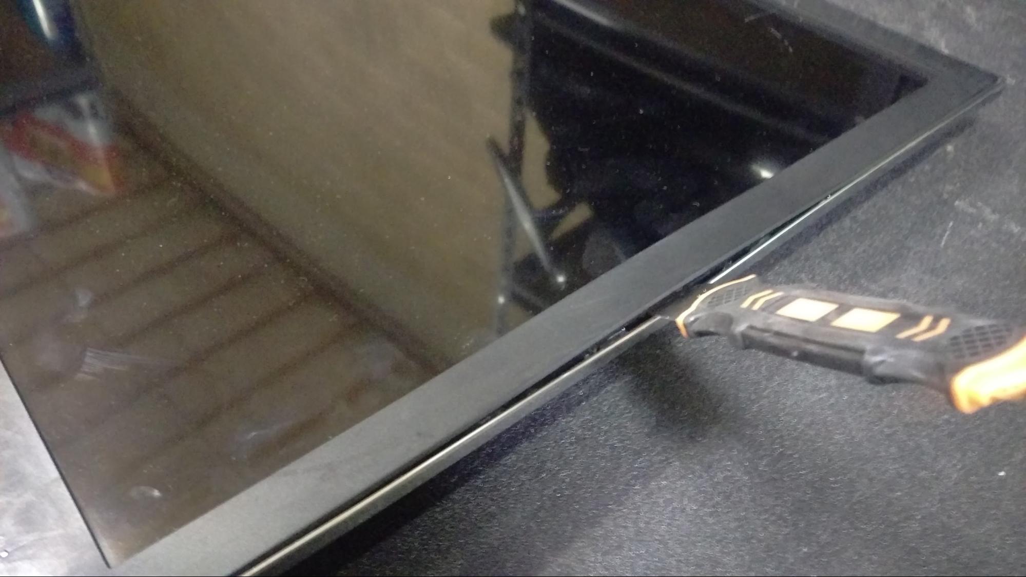 Flip the screen around, and stick the opener tool between the front panel and the middle panel. Like with the rear panel, you must move incrementally along the panel, prying gently up (being careful not to scratch or crack the screen -- plastic tools are best for this) until all the tabs have been undone.