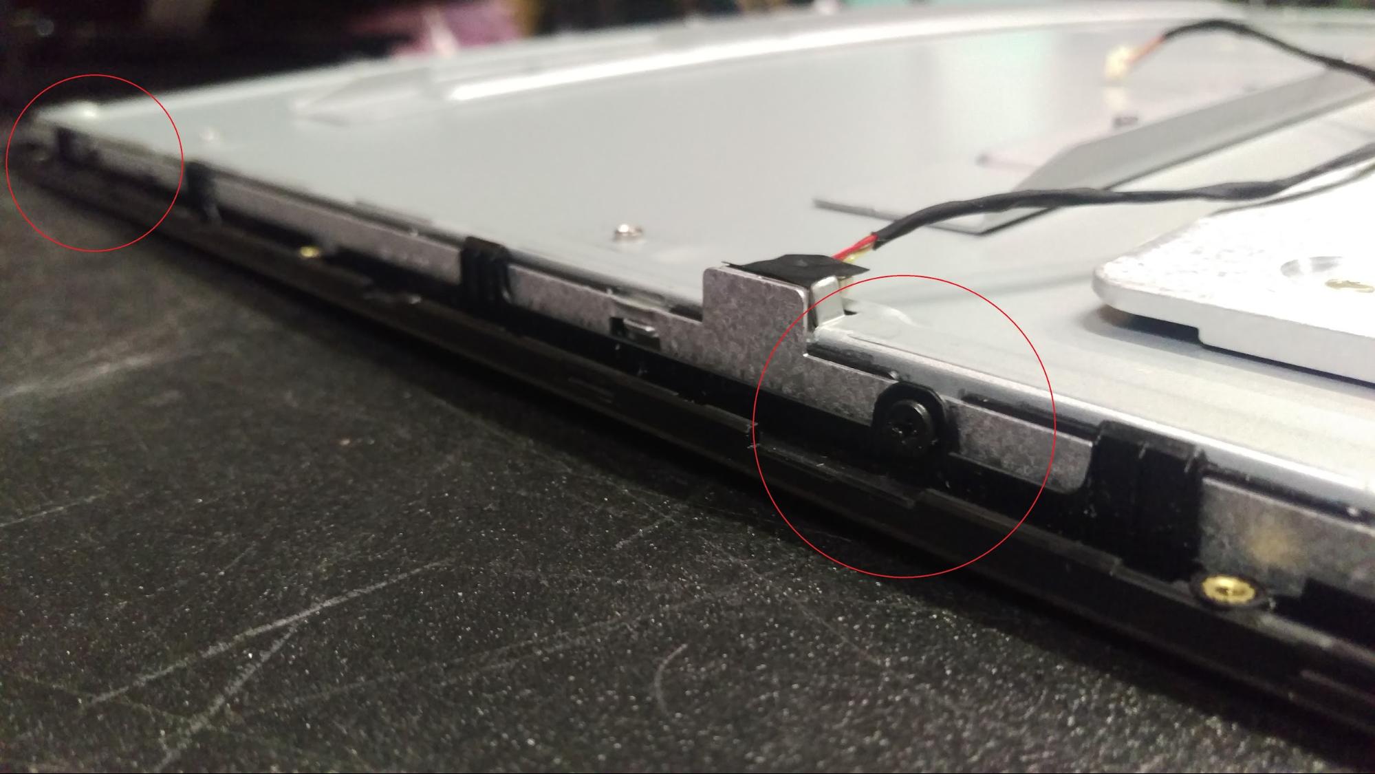 Now all that should be left is the front panel and LCD screen. The front panel is attached to the LCD with 4 screws on the right and left sides, so remove those and the panel should come right off.