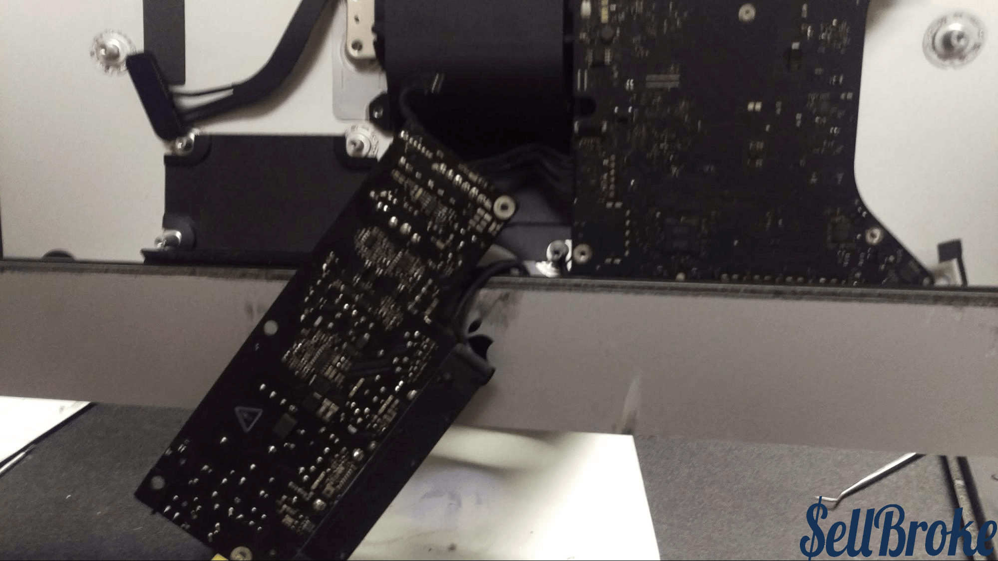 Be careful with this next part because it can get a bit complicated, but now that these have been disconnected you are ready to pull up on the power board, towards the top of the computer. The powerboard is attached to the computer frame and the motherboard, so don’t get too rough without, be careful and let it hang once you’ve removed it from underneath the frame.