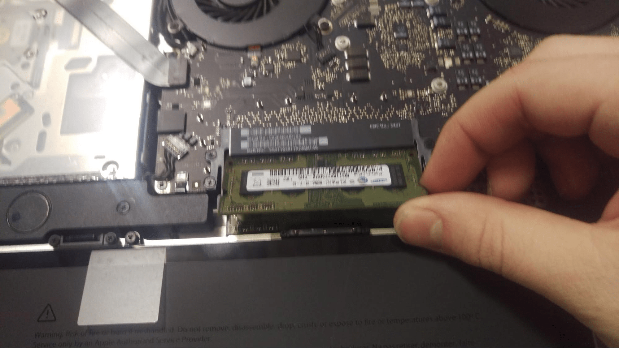 As seen in the photo, “reverse pinch” the tabs at the ends of the RAM slot. This step should be very easy and quick.