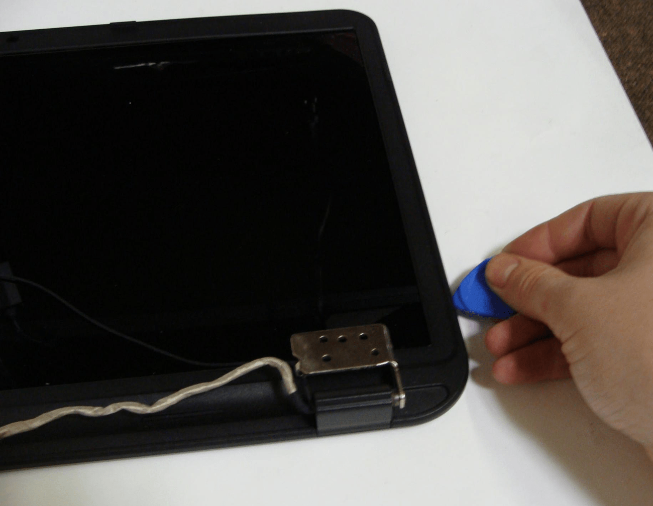 We can separate the LCD panel from the bottom case. Simply remove the eight screws, four on each bracket, then the panel should separate by itself.
