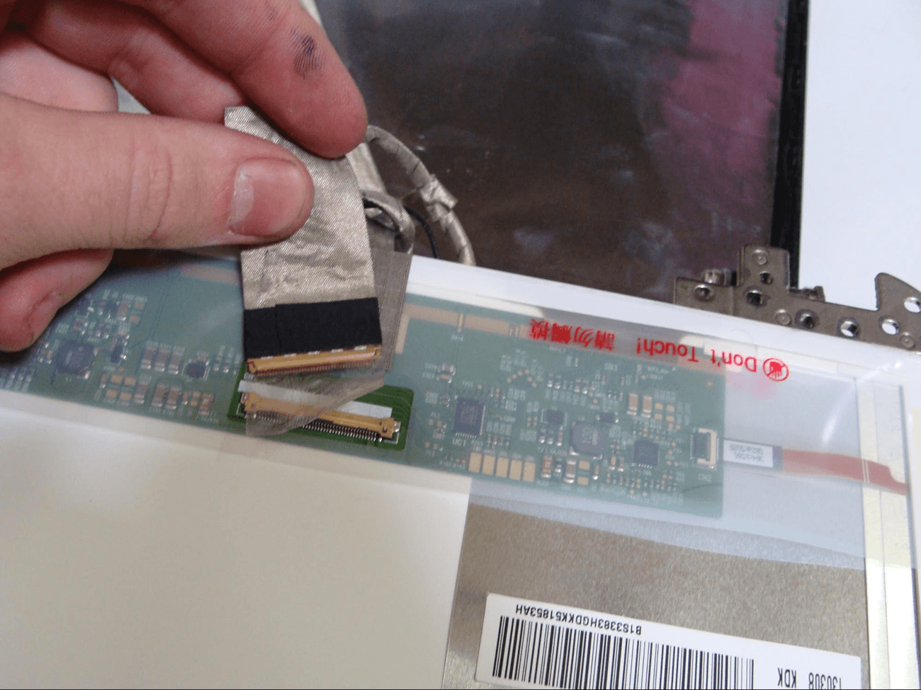 Disconnect the LVDS cable on the back of the LCD by peeling up the tape, then simply pulling the cable out of the connection.