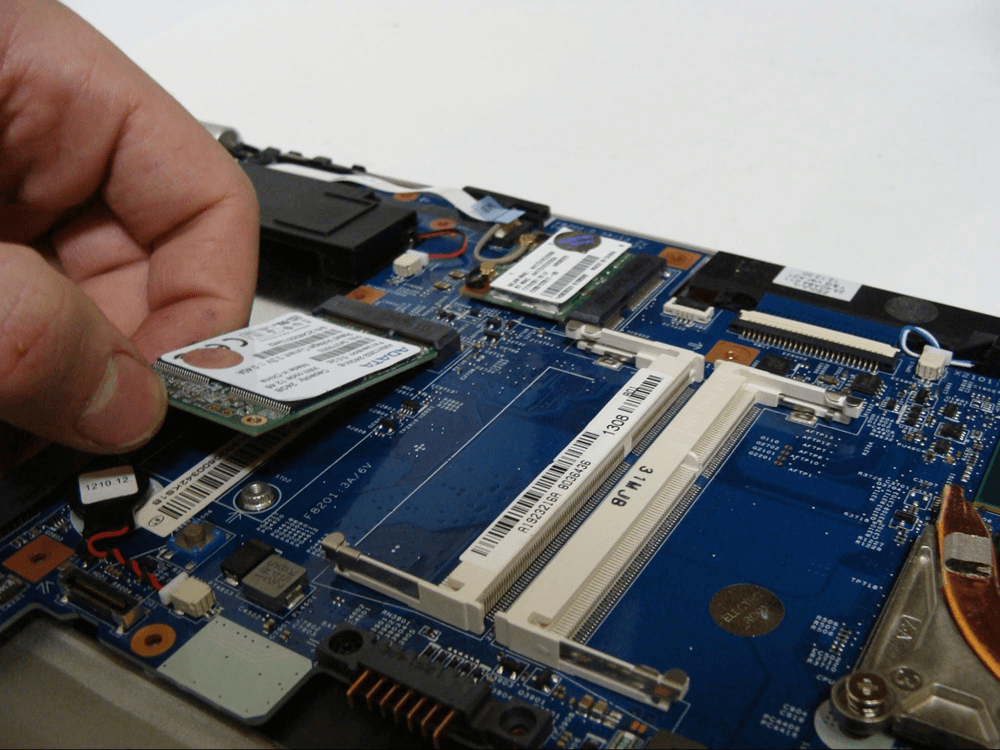 To remove the SSD, remove the phillips screw, then simply pull the SSD away from the connector, as shown.